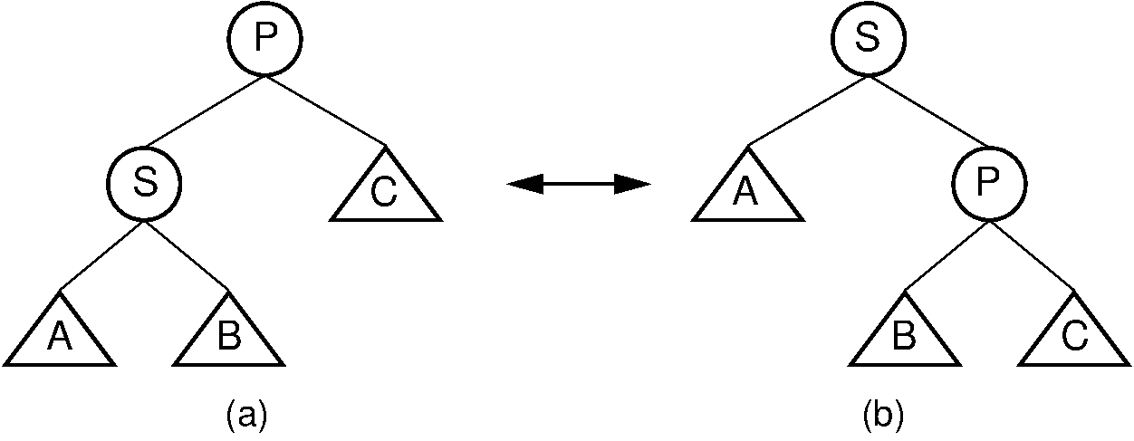 Figure 28.4.1: Splay tree single rotation. This rotation takes place only when the node being splayed is a child of the root. Here, node \(S\) is promoted to the root, rotating with node \(P\). Because the value of \(S\) is less than the value of \(P\), \(P\) must become \(S\) 's right child. The positions of subtrees \(A\), \(B\), and ;math:C are altered as appropriate to maintain the BST property, but the contents of these subtrees remains unchanged. (a) The original tree with \(P\) as the parent. (b) The tree after a rotation takes place. Performing a single rotation a second time will return the tree to its original shape. Equivalently, if (b) is the initial configuration of the tree (i.e., \(S\) is at the root and \(P\) is its right child), then (a) shows the result of a single rotation to splay \(P\) to the root.