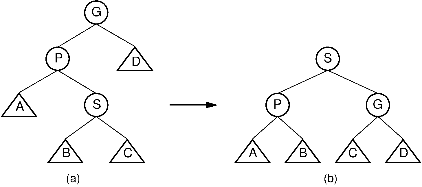 Figure 26.3.3: Splay tree zigzig rotation. (a) The original tree with \(S\), \(P\), and \(G\) in zigzig formation. (b) The tree after the rotation takes place. The positions of subtrees \(A\), \(B\), \(C\), and \(D\) are altered as appropriate to maintain the BST property.¶