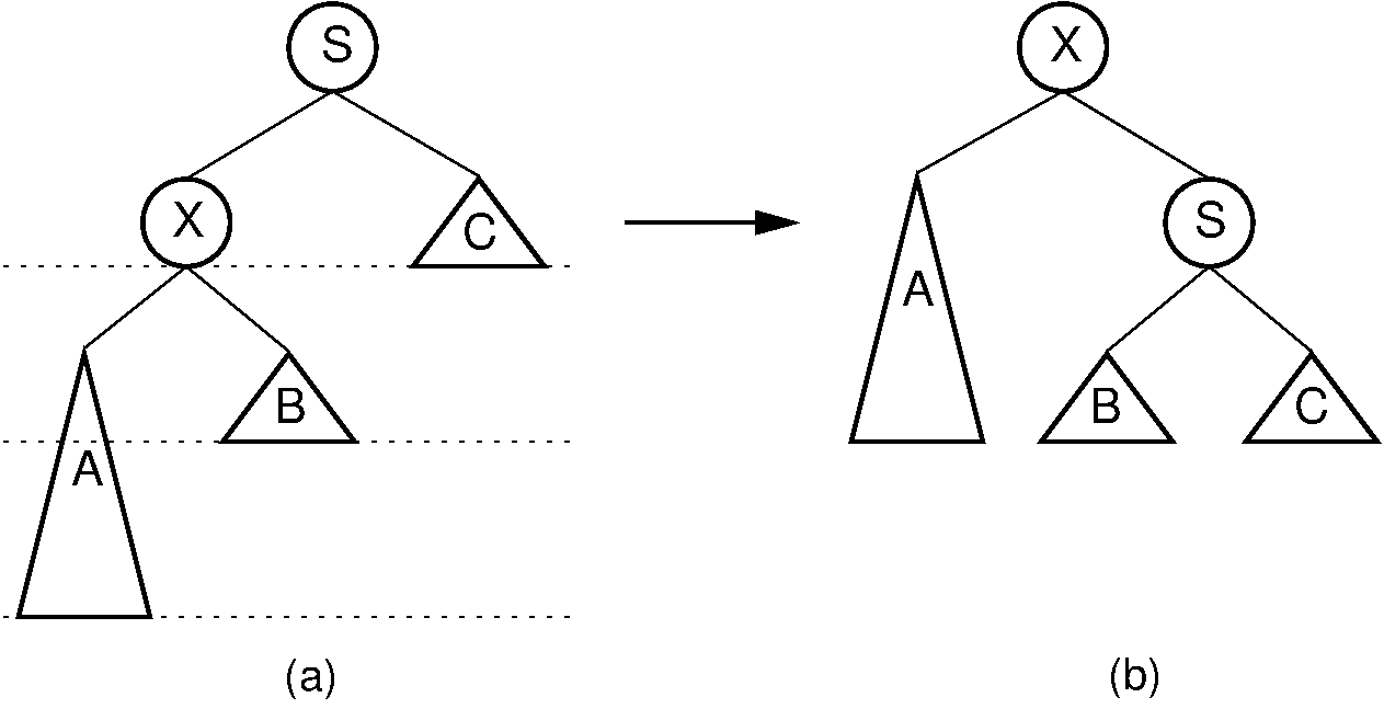 Figure 26.2.2: A single rotation in an AVL tree. This operation occurs when the excess node (in subtree \(A\)) is in the left child of the left child of the unbalanced node labeled \(S\). By rearranging the nodes as shown, we preserve the BST property, as well as re-balance the tree to preserve the AVL tree balance property. The case where the excess node is in the right child of the right child of the unbalanced node is handled in the same way.¶