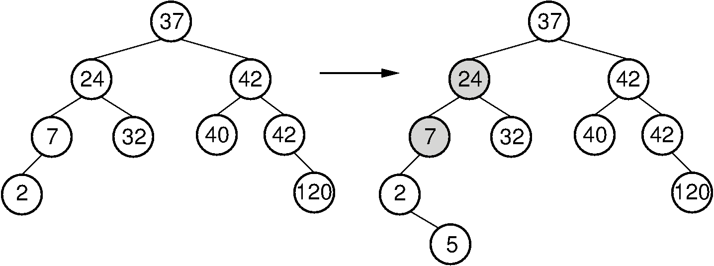 Figure 26.2.1: Example of an insert operation that violates the AVL tree balance property. Prior to the insert operation, all nodes of the tree are balanced (i.e., the depths of the left and right subtrees for every node differ by at most one). After inserting the node with value 5, the nodes with values 7 and 24 are no longer balanced.¶