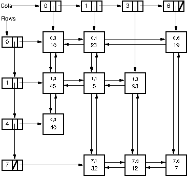 The corresponding orthogonal array is shown in the Figure. Here we have a list of row headers, each of which contains a pointer to a list of matrix records. A second list of column headers also contains pointers to matrix records. Each non-zero matrix element stores pointers to its non-zero neighbors in the row, both following and preceding it. Each non-zero element also stores pointers to its non-zero neighbors following and preceding it in the column. Thus, each non-zero element stores its own value, its position within the matrix, and four pointers. Non-zero elements are found by traversing a row or column list. Note that the first non-zero element in a given row could be in any column; likewise, the neighboring non-zero element in any row or column list could be at any (higher) row or column in the array.