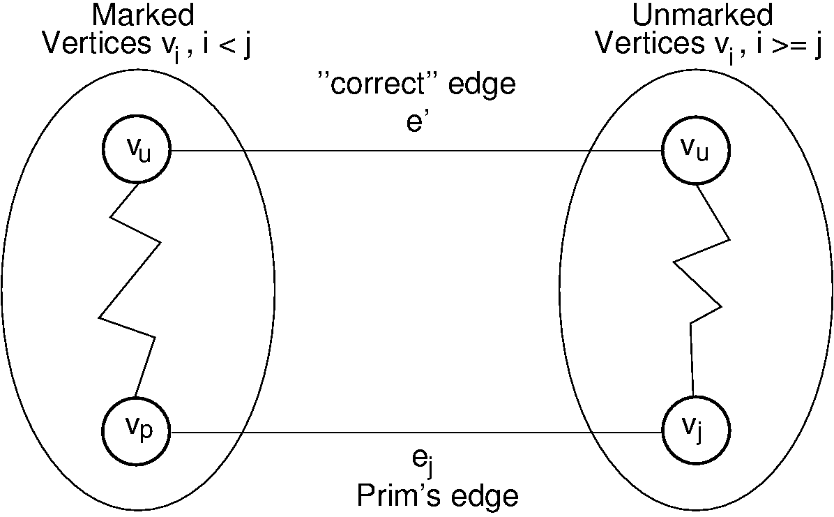 Because \(\mathbf{T}\) is a tree, there exists some path in \(\mathbf{T}\) connecting \(v_p\) and \(v_j\). There must be some edge \(e'\) in this path connecting vertices \(v_u\) and \(v_w\), with \(u < j\) and \(w \geq j\). Because \(e_j\) is not part of \(\mathbf{T}\), adding edge \(e_j\) to \(\mathbf{T}\) forms a cycle. Edge \(e'\) must be of lower cost than edge \(e_j\), because Prim's algorithm did not generate an MCST. This situation is illustrated in Figure 17.6.2. However, Prim's algorithm would have selected the least-cost edge available. It would have selected \(e'\), not \(e_j\). Thus, it is a contradiction that Prim's algorithm would have selected the wrong edge, and thus, Prim's algorithm must be correct. BOX HERE