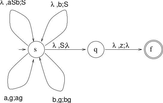 - Three states: \(s, q, f\)Start in state \(s\), put bottom marker \(z\) onto stack