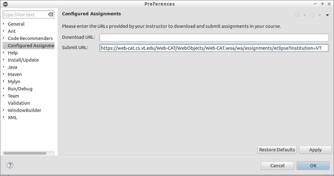 Step 6: Finally go to Window->Preferences. Then select Preferences. A window similar to the below will appear. Fill in the submit URL with this: https://web-cat.cs.vt.edu/Web-CAT/WebObjects/Web-CAT.woa/wa/assignments/eclipse?institution=VT. Leave the Download URL box blank unless you have been given an URL from another resource.