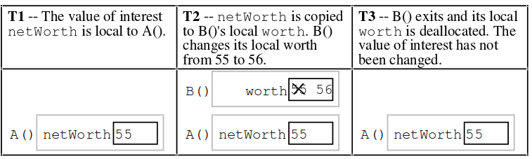 B() adds 1 to its local worth copy, but when B() exits, worth is deallocated, so changing it was useless. The value of interest, netWorth, rests unchanged the whole time in A()'s local storage. A function can change its local copy of the value of interest, but that change is not reflected back in the original value. This is really just the old "independence" property of local storage, but in this case it is not what is wanted.