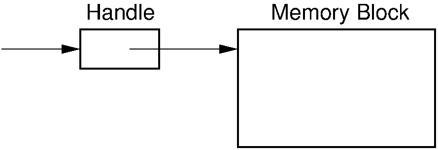 Figure 11.10.1: Using handles for dynamic memory management. The memory manager returns the address of the handle in response to a memory request. The handle stores the address of the actual memory block. In this way, the memory block might be moved (with its address updated in the handle) without disrupting the application program.¶
