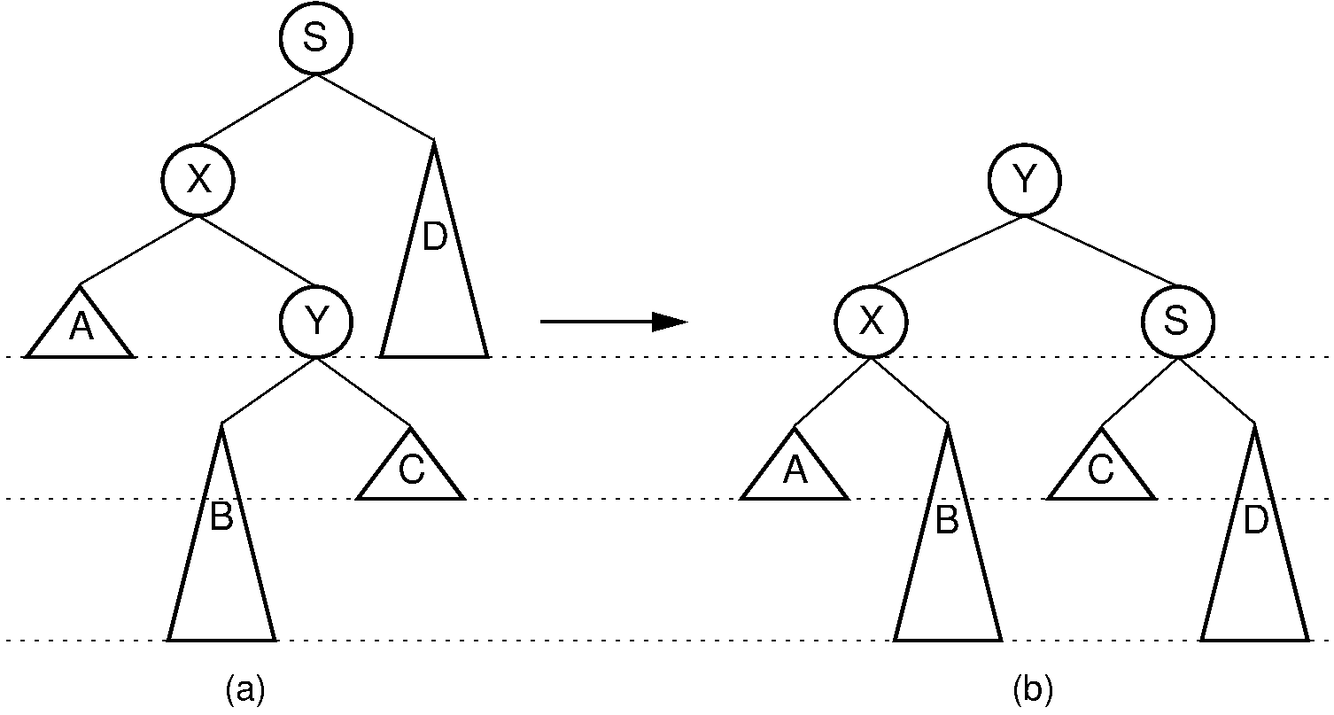 Our problem now is how to balance the tree in O(logn) time. It turns out that we can do this using a series of local operations known as rotations. Cases 1 and 4 can be fixed using a single rotation, as shown in Figure 28.3.2. Cases 2 and 3 can be fixed using a double rotation, as shown in Figure 28.3.3.
