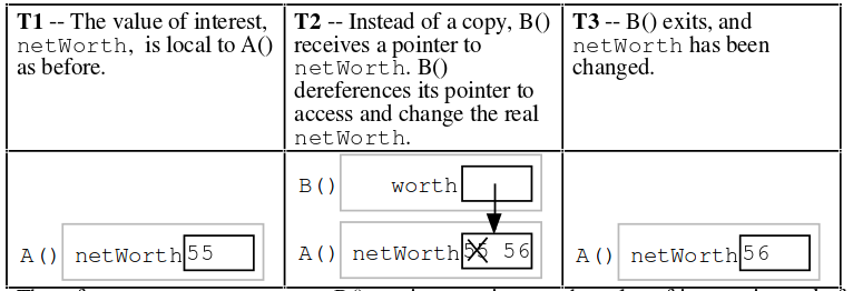 use pass by value. Three points in time, T1, T2, and T3 are marked in the
