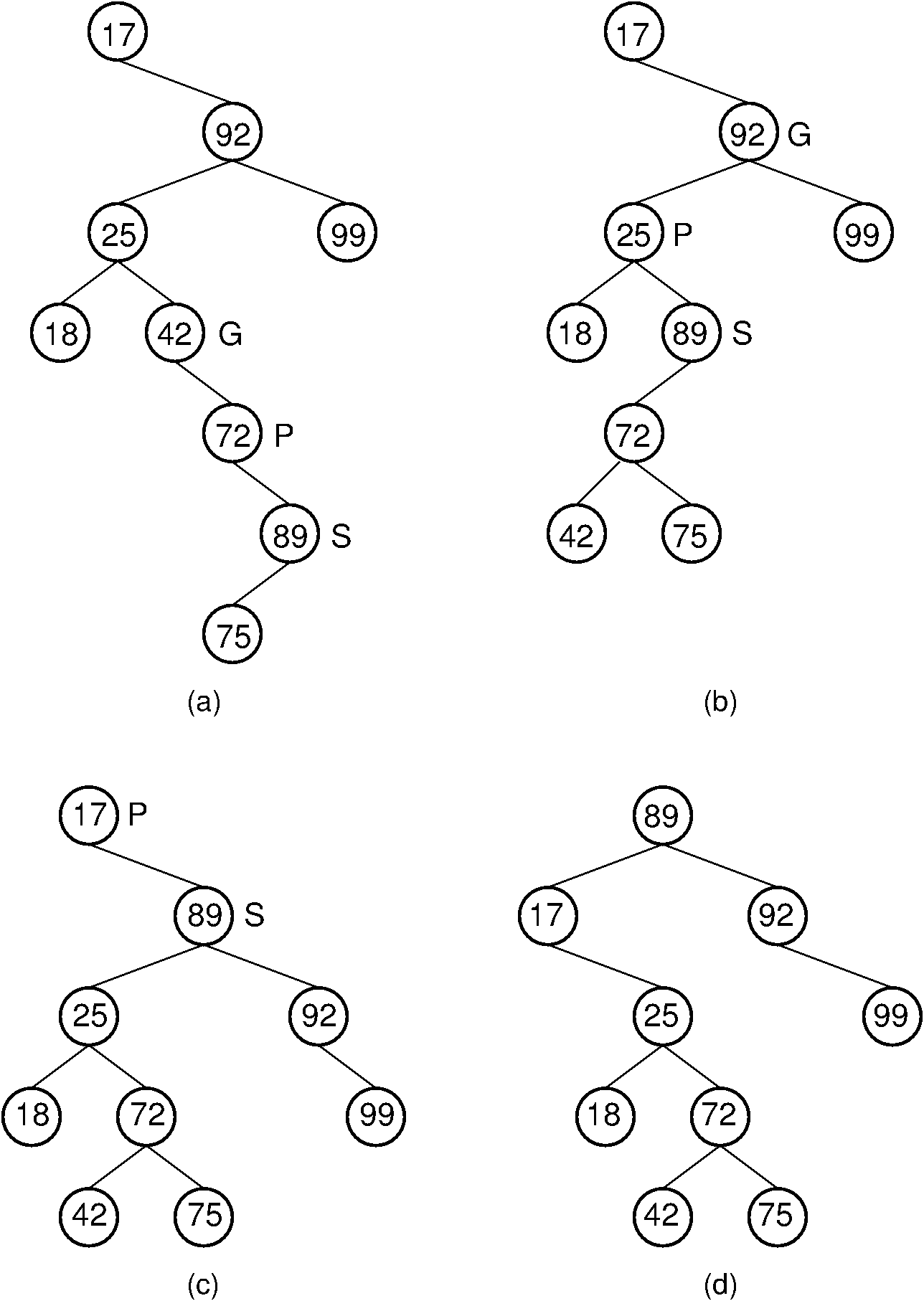 Figure 28.4.4: Example of splaying after performing a search in a splay tree. After finding the node with key value 89, that node is splayed to the root by performing three rotations. (a) The original splay tree. (b) The result of performing a zigzig rotation on the node with key value 89 in the tree of (a). (c) The result of performing a zigzag rotation on the node with key value 89 in the tree of (b). (d) The result of performing a single rotation on the node with key value 89 in the tree of (c). If the search had been for 91, the search would have been unsuccessful with the node storing key value 89 being that last one visited. In that case, the same splay operations would take place.